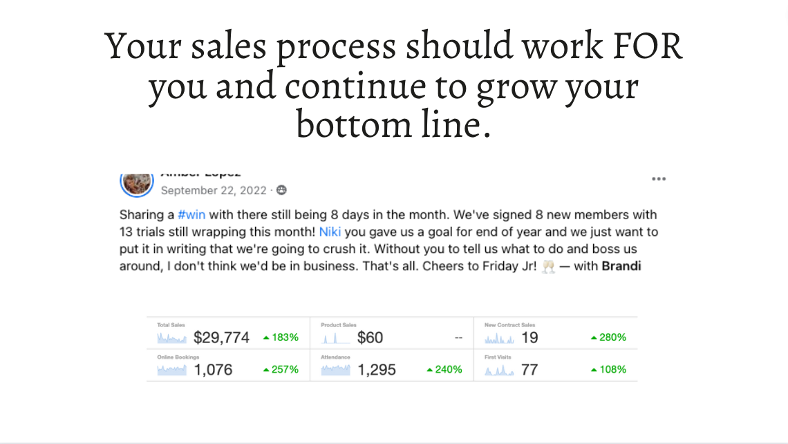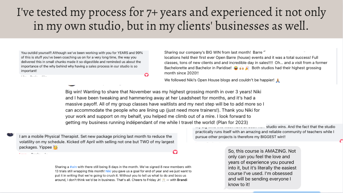 Hello! I just looked at my November sales, they are $23,000! Highest in over 3 years! Thanks for your help!!! 💕🥳 All of our classes have waiting lists and more clients are getting upset that they can’t get in. Thanks Lead Sheet and for all your help Niki!.