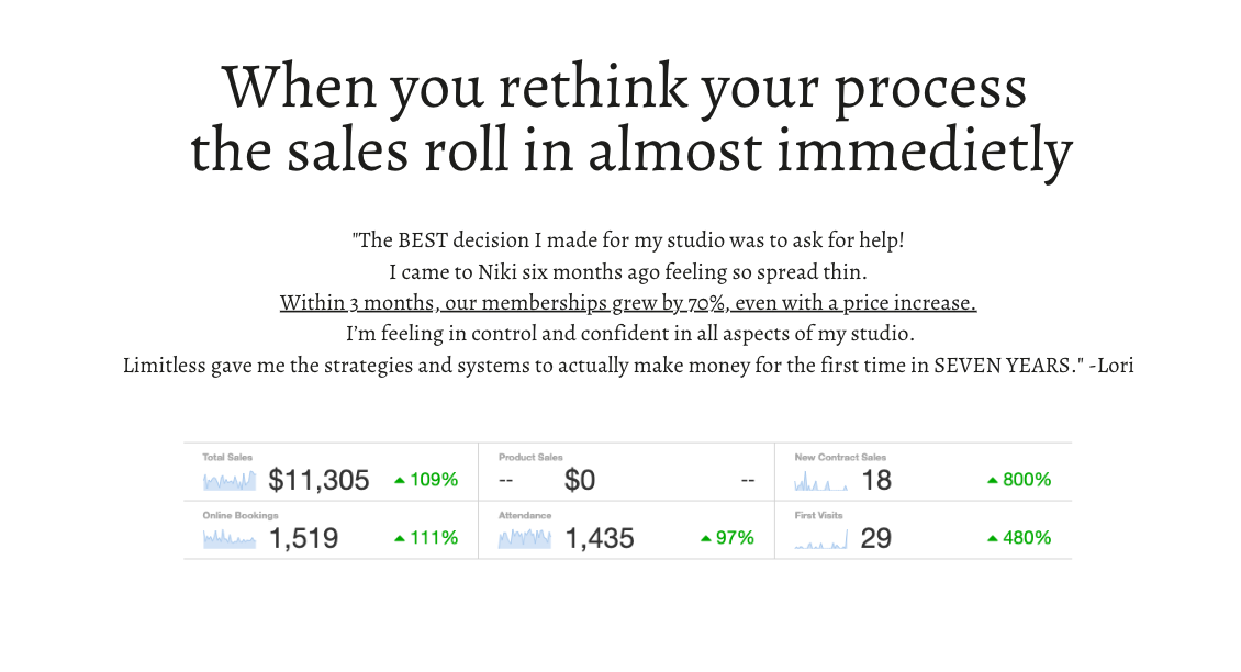 We are 2 months in and are already seeing the ROI both financially and culturally in our business. Our auto pays are up 10% in just 3 weeks of using the Limitless Sales & Client flow sheets. We're also hearing amazing feedback from new clients about how welcome they feel in our space - this is definitely thanks to the contact points Niki trained us on. We've needed support like this for so long, and I'm SO thrilled we found Niki. Investing time and $ to work with Limitless has literally already paid for itself in 2 months. We couldn't be more thrilled. :)