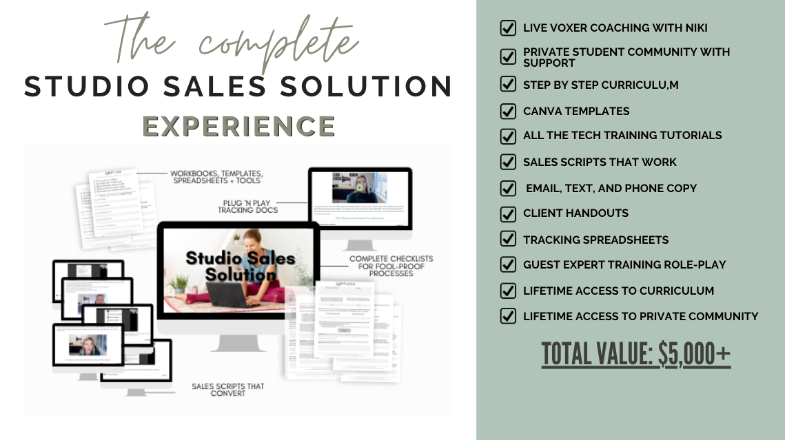 Aka the exact framework and plug-and-play tools to take you from stressed-out studio owner to successful sales specialist- without throwing your principles to the wind or cornering your clients with salesy or pushy scripts.